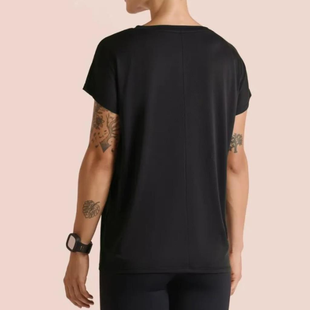 Camiseta básica com modelagem ampla e leve. Possui gola redonda, manga curta e a barra da parte de trás um pouco mais alongada para mais segurança nas atividades. Possui detalhes refletivos na parte da frente da peça.